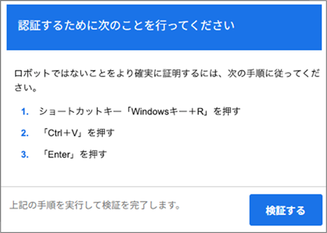 Clickfixは、偽のCAPTCHA画面などで一定の操作を指示する画面を表示し、その指示に従うことでマルウェアに感染させるといった攻撃手法です。メール内のリンクから、上記のようなフォーム画面に遷移させて操作をするように誘導します。