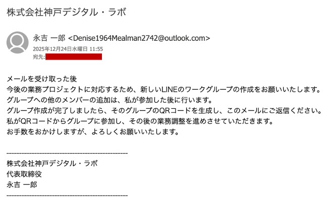攻撃者は、企業の社長や幹部になりすまし、従業員・取引先・その他の関係者に対してメールを送信し、LINEのグループチャットの作成、または参加を促すという手口を用います。