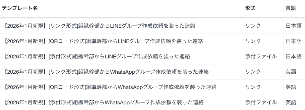 これらのテンプレートは、観測された脅威の挙動をもとに設計されており、リンクのクリック、添付ファイルの開封、QRコードの読み取りなどを通じて、架空のLINEグループへの参加を促す内容となっています。