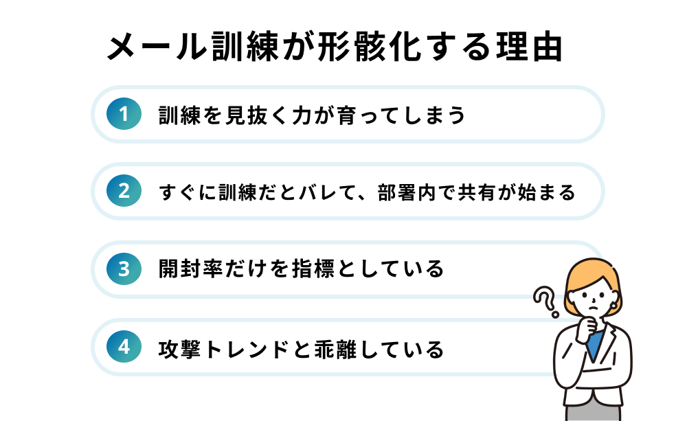 メール訓練が形骸化すると、「訓練を実施している」という事実だけで安心してしまう状態になりかねません。